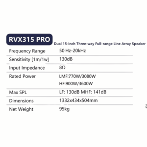 El sistema de arreglo lineal RVX 315 PRO cuenta con un innovador diseño de 11 altavoces, equipado con 2 woofers de 15″, 6 medios de 5″ y 3 tweeters de 3″, proporcionando cobertura de frecuencia completa desde 50 Hz hasta 20 kHz para una calidad de sonido excepcional. Sus altavoces personalizados mejoran la claridad y el detalle en voces e instrumentos. El modo de cruce de 2 vías flexible satisface una variedad de necesidades de rendimiento, mientras que la potente respuesta de baja frecuencia se adapta a diversos estilos musicales. El diseño ajustable del arreglo optimiza la consistencia del campo sonoro y permite una conectividad y despliegue rápidos con procesadores digitales convencionales. El RVX 315 PRO es una opción ideal para refuerzo sonoro de tamaño medio a grande, muy apreciado por ingenieros de audio profesionales y empresas de alquiler.